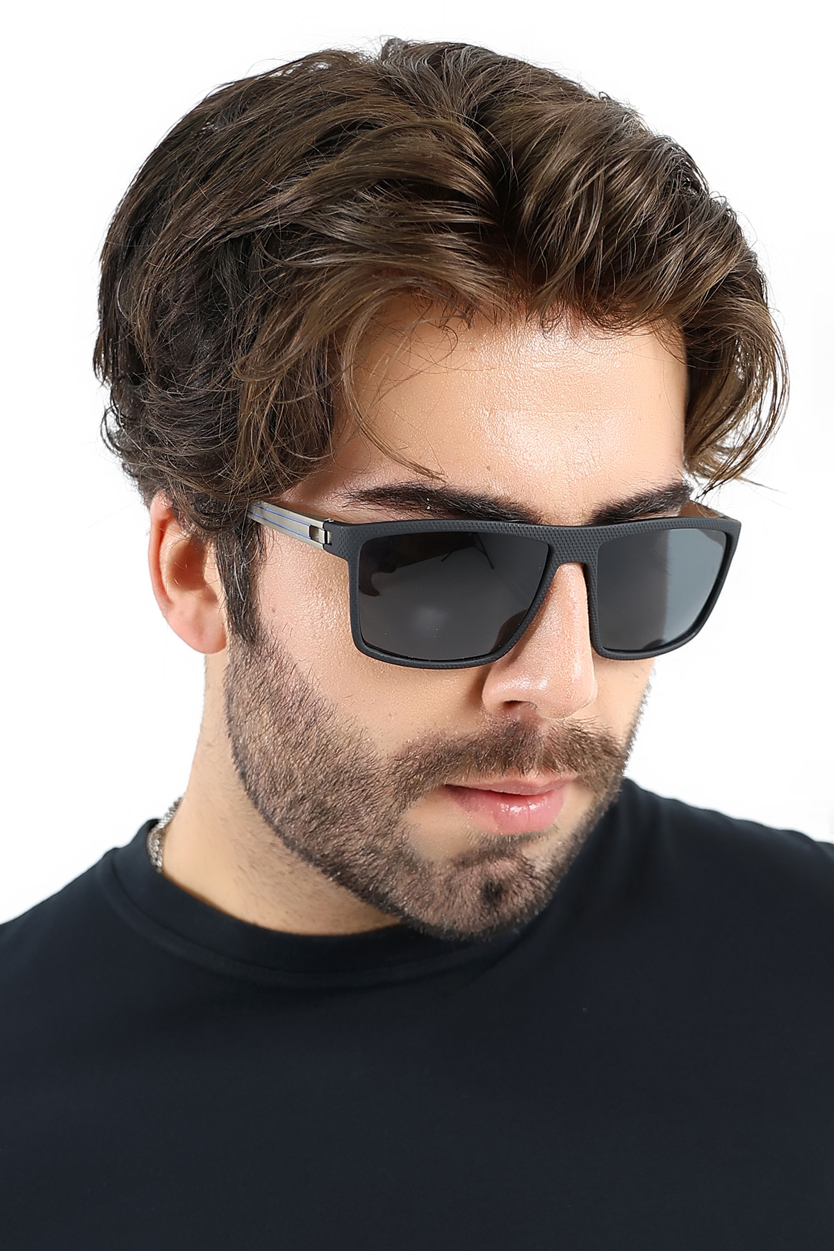 Erkek Mat Siyah Kare UV400 Güneş Gözlüğü Gümüş Detay 25-11 C2 M
