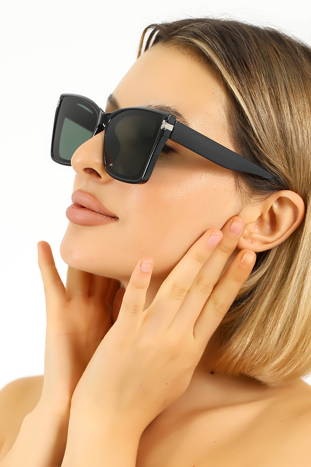 - Geometrik formu, modern bir görünüm sunarak yüz hatlarınıza sofistike bir dokunuş katar.