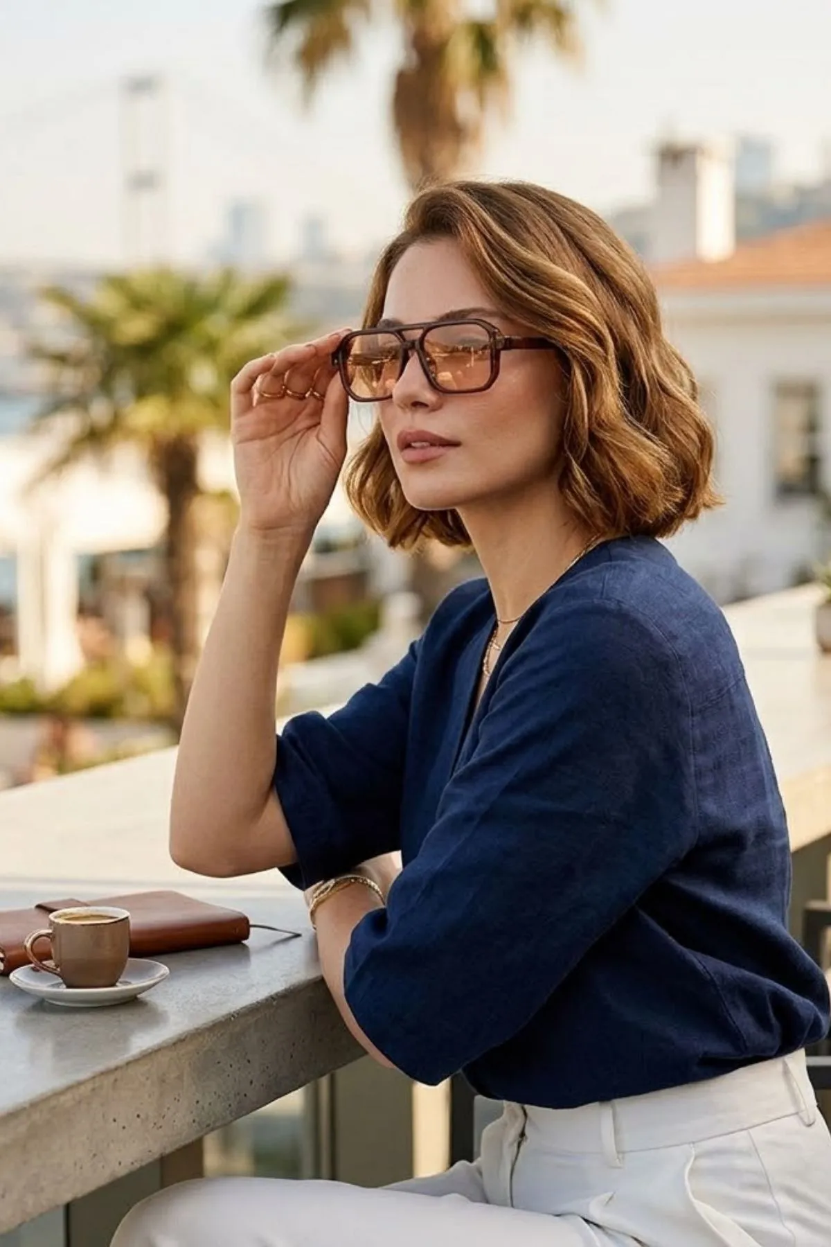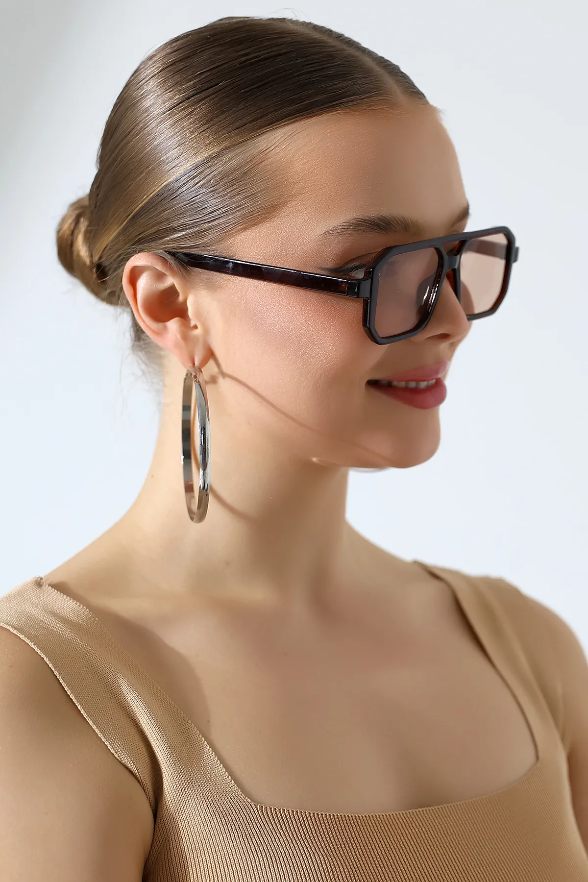 - Kare formu ile yüz hatlarınıza modern bir dokunuş eklerken, düz deseniyle kolayca kombinlenebilir.